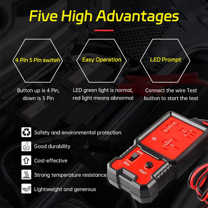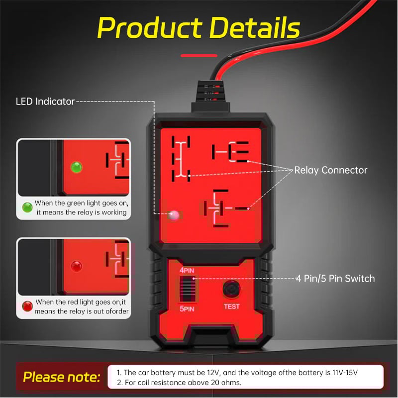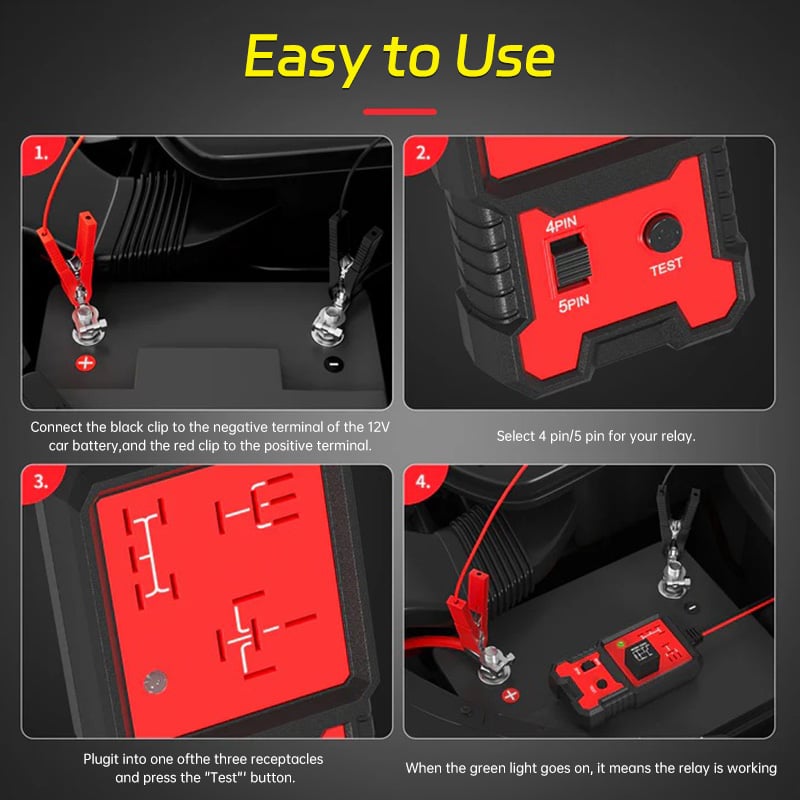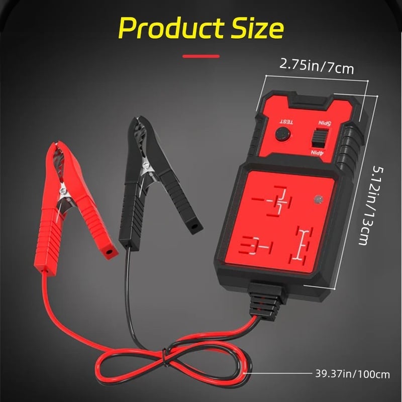 Compatible with 4-pin and 5-pin relays. Just connect it to the relay’s coil using a 12V car battery to quickly check for faults, no need to remove the relay. Saves you time and money.